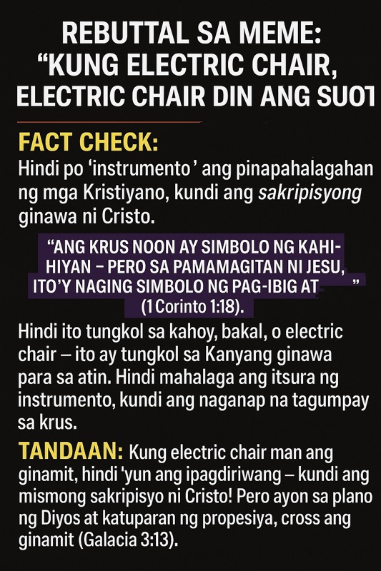 Ang meme ay sadyang ginagamit upang lituhin ang mga hindi marunong bumasa ng konteksto, at hindi nakabatay sa kabuuang mensahe ng Kasulatan. Oo, ang krus ay dating kasangkapan ng parusa — ngunit sa pananampalatayang Kristiyano, ito ay naging simbolo ng pag-ibig ng Diyos at ng tagumpay ng Anak sa kasalanan.