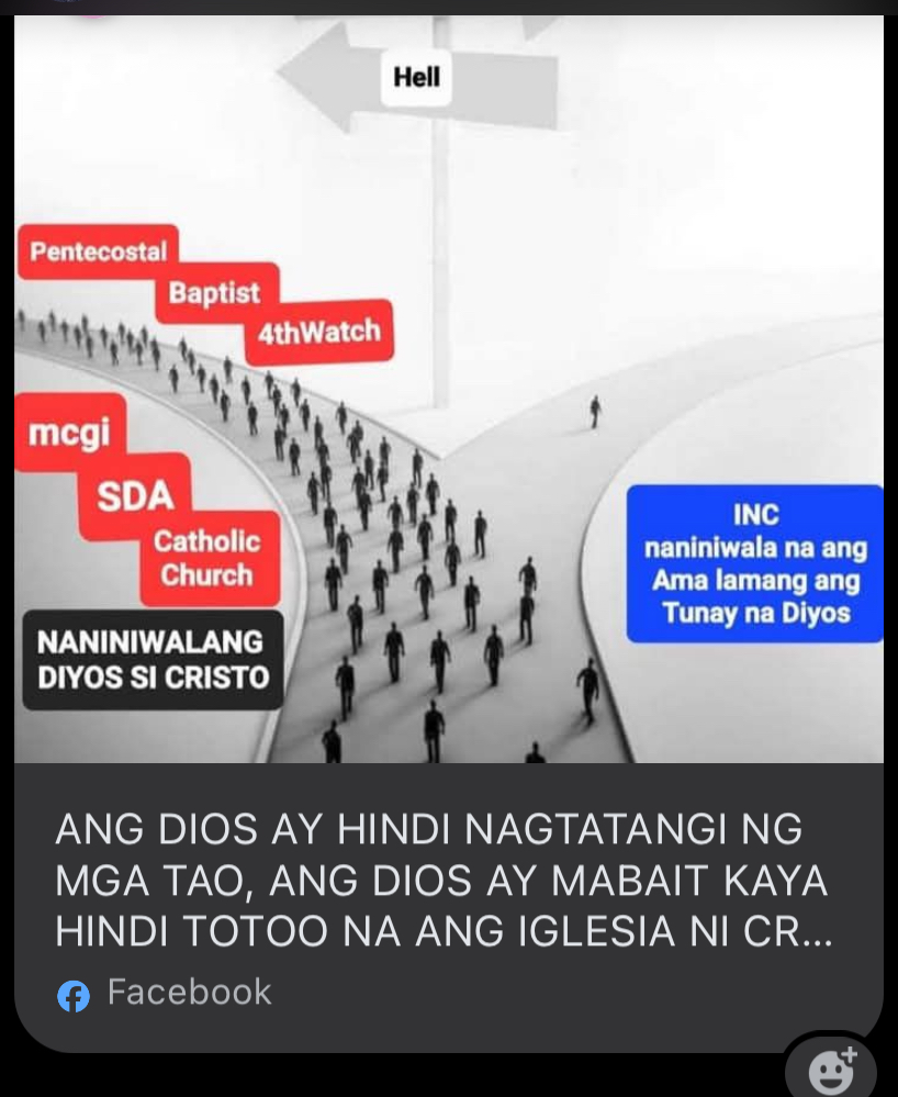 Ang meme na ito ay lubos na mali at mapanlinlang. Mali ang kanilang paniniwala na si Hesus ay hindi Diyos, mali ang kanilang eksklusibong kaligtasan, at mali ang kanilang pag-aakusa na ang iba ay patungo sa impiyerno. Ang tunay na iglesia ni Kristo ay mas malawak kaysa sa INC—ito ay ang lahat ng sumasampalataya kay Hesus bilang Panginoon at Tagapagligtas. Ang Diyos ay mabait at hindi nagtatangi, tulad ng sinasabi ng caption, pero ang INC ang nagtatangi at humahatol sa iba, na salungat sa aral ng Diyos. Bukod dito, ang INC mismo ay may mga tradisyon na wala sa Bibliya, kaya mali ang kanilang pag-atake sa iba. Ang tunay na pananampalataya ay nakabatay sa pag-ibig kay Hesus at sa kapwa, hindi sa paghuhusga at pagtatangi tulad ng ipinapakita ng meme na ito.